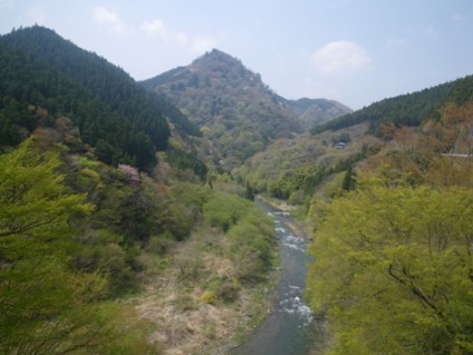 新緑の御斎所山です。新緑やヤマザクラがとてもきれいです。写真は県道いわき石川線からのもので、下を流れるのは鮫川です。なお、県道いわき石川線のこの付近は通行止めで、余震も続いていますので十分注意してください。